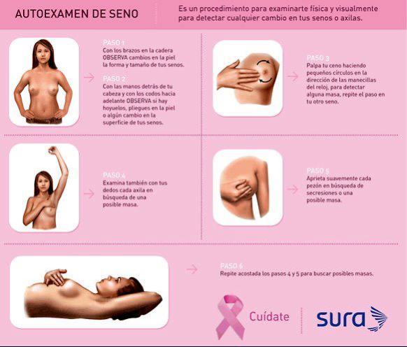El examen de seno se debe realizar en posición vertical, sentada y acostada con las manos de la mujer detrás de la cabeza. Los senos deben ser inspeccionados en busca de diferencias en el tamaño, retracción de la piel o del pezón, patrones venosos prominentes y signos de inflamación. Se debe usar la superficie plana de la punta de los dedos para palpar el tejido mamario contra la pared torácica. Las zonas axilares y supraclaviculares deben ser revisadas en busca de nódulos. El pezón debe comprimirse suavemente para comprobar si hay secreciones.