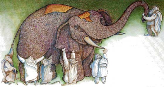 .- Monjes, esos disidentes son ciegos que no ven, que desconocen tanto la verdad como la no verdad, tanto lo real como lo no real. Ignorantes, polemizan y se enzarzan como me habéis relatado. Ahora os contaré un suceso de los tiempos antiguos. Había un maharajá que mandó reunir a todos los ciegos que había en Sabathi y pidió que los pusieran ante un elefante y que contasen, al ir tocando al elefante, qué les parecía. Unos dijeron, tras tocar la cabeza: “Un elefante se parece a un cacharro”; los que tocaron la oreja, aseguraron: “Se parece a un cesto de aventar”; los que tocaron el colmillo: “Es como una reja de arado”; los que palparon el cuerpo: “Es un granero”. Y así, cada uno convencido de lo que declaraba, comenzaron a querellarse entre ellos.