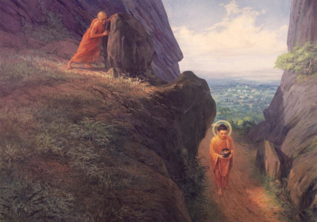 Cierto día que el Buda estaba paseando tranquilamente, Devadatta, a su paso, le arrojó una pesada roca desde la cima de una colina, con la intención de acabar con su vida. Sin embargo, la roca sólo cayó al lado del Buda y Devadatta no pudo conseguir su objetivo. El Buda se dio cuenta de lo sucedido permaneció impasible, sin perder la sonrisa de los labios.